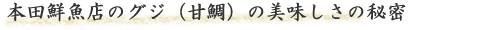 甘みと旨みがとても強い魚です グジ(アマダイ)は、関西ではとても珍重される魚で、京料理には欠かせません。本田鮮魚店では若狭湾で取れたグジを背中から割り、軽く塩をして一晩寝かせ「一汐グジ」としてお出ししています。 |