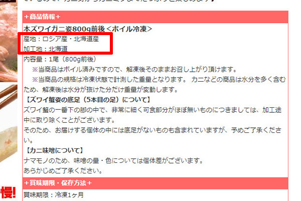 北海道のカニ通販の会社の多くが、実は北海道産のカニだけを扱っているわけではありません。例えば最北の海鮮市場さんの本ズワイガニ姿800g前後の場合・・・