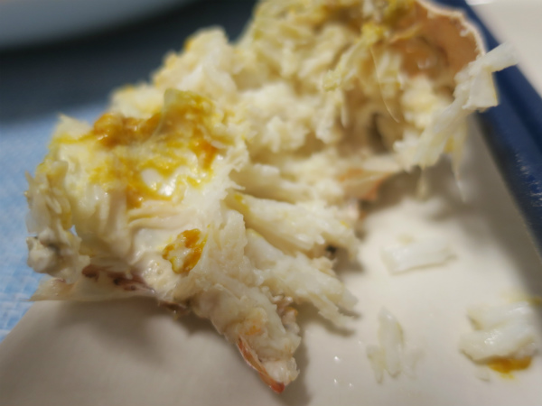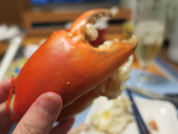 ハサミの部分はさらにふわふわ。ふわふわ度をどう表現するかが難しいけど、生クリームぐらいのふわふわ感。口の中に入れると溶けます。生のカニならわかるけど、ゆでガニでこんなにふわふわになるとは思わなかった。